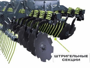 Штригельные секции между рядами дисков и перед катком работают как экраны, предотвращая накидывание почвы от первого ряда дисков на второй и от второго ряда далее — на каток.